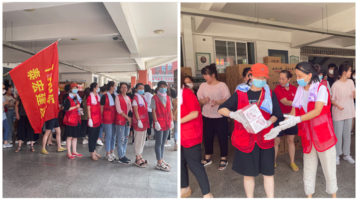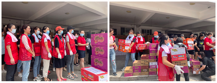 女同事不怕热、不怕累,一箱箱、一件件不停的往车上搬运。她们说:“众人拾柴火焰高,相信在大家共同的努力下,一定会渡过难关,迎来彩虹!”